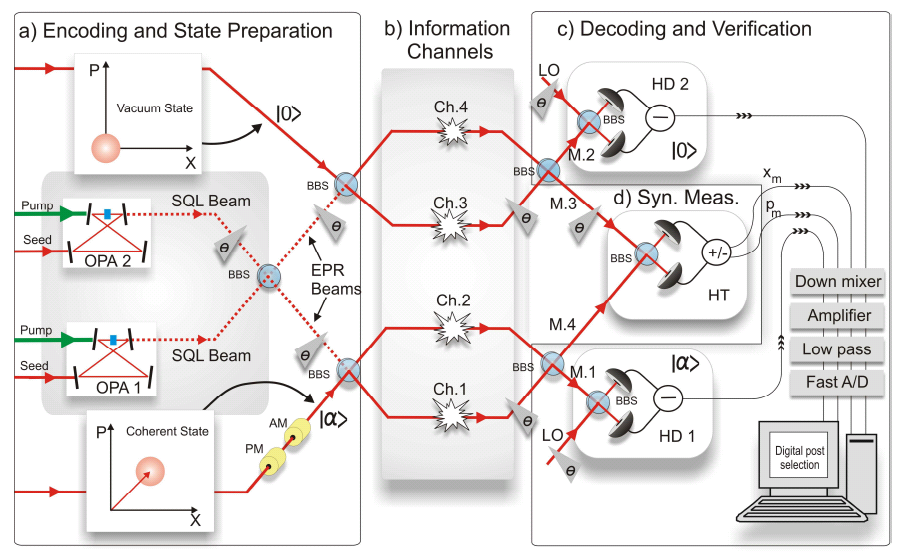 Figure 5: Experimental and theoretical results for the phase variance of the input coherent state (Coh), the input state after the mixing with thermal noise (Th) and the heralded output states (M=1, …, M=4). Enhanced phase information is already observed for a heralding threshold of just a single click in the detector. We verified the increase of phase information in an experimental implementation by homodyne tomography of the heralded states for threshold values of up to four clicks in the detector. We derived the Holevo phase variance as a measure for the phase uncertainty and compared the results for various threshold parameters with our theoretical model. We could clearly observe the enhanced phase information, yet for a threshold of only a single click in the detector, as presented in Fig. 5. Publications: F. Ferreyrol, M. Barbieri, R. Blandino, S. Fossier, R. Tualle-Brouri, and P. Grangier, Implementation of a nondeterministic optical noiseless amplifier, Phys. Rev. Lett. 104, 123603 (2010). A. Zavatta, J. Fiurášek, and M. Bellini, A high-fidelity noiseless amplifier for quantum light states, Nature Photonics 5, 52–56 (2011). M. A. Usuga, C. R. Müller, C. Wittmann, P. Marek, R. Filip, Ch. Marquardt, G. Leuchs and U. L. Andersen, Noise-powered probabilistic concentration of phase information, Nature Physics 6, 767–771 (2010) Experimental demonstration of CV quantum error correction protecting against erasuresQuantum information processing