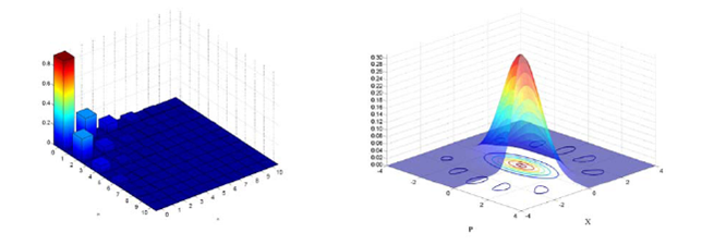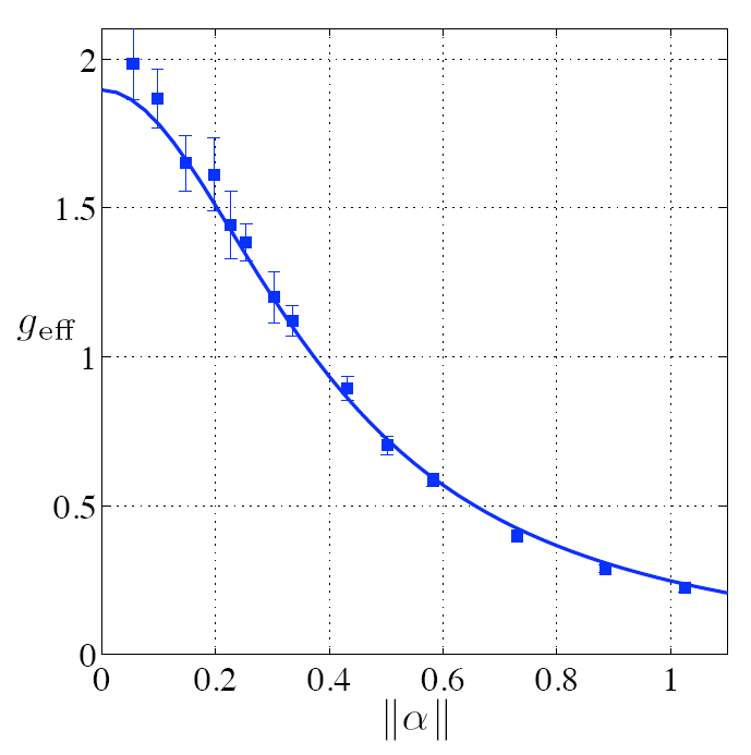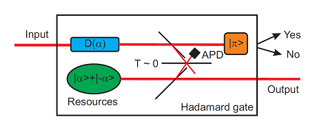 Quantum gates for cat-state qubits![]() Figure 1: Schematic of the Hadamard gate. In the experimental realization, the resource state was replaced by a squeezed state and the |p> projector was a homodyne detector; if the quadrature measurement outcome fall within a certain interval and the APD is firing, the output is projected onto a Hadamard transformed state. A schematic of the Hadamard gate is presented in Fig. 1. The scheme based on a squeezed state resource, linear operations and two projective measurements; a discrete variable and a continuous variable measurement. The input state - a coherent state superposition - is first displaced by an amount equal to the excitation of the coherent states of the computational basis. A single photon is then jointly subtracted from the displaced input state and a resource state (a coherent state superposition state) by means of beam splitters and a single photon counter. Finally, the state is projected onto an amplitude quadrature using a homodyne detector, and the remaining mode falls into the Hadamard transformed state. By injecting the computational basis states (|a> and |-a>) into the gate the function of the gate was characterized by reconstructing the Wigner functions of the transformed output states and calculating the fidelity with ideally transformed state. ![]() Figure 2: Density matrix and Wigner function for the output state for |a> as the input state. The Fidelity to the ideal output state is F=94%. The gate was implemented using a squeezed state as a resource in replacement of the coherent state superposition state as the overlap between these two states was more than 90%. The squeezed state is produced through down-conversion in a periodically poled KTP crystal pumped with pico-second pulses at 415nm, thus producing pulsed squeezed light at 830nm. As an input state either |a> or |-a> was used which are displaced to |0> and |2a>. To further simplifyy the scheme, the input state is defined in the same spatial mode as the ancillae squeezed state but in orthogonal polarization modes; this facilitate the mixing of the two modes in a waveplate followed by a polarizing beam splitter. By jointly subtracting a single photon from the two states using an APD and by conditioning the output on successful measurement outcomes, the final state is formed and fully characterized by means of homodyne tomography. ![]() Figure 3: Density matrix and Wigner function for the output state for |-a> as the input state. The fidelity to the ideal output state is F=51%. The results of a Hadamard transform of the two inputs, |a> and |-a>, are shown in Fig. 2 and 3. We present the density matrices and the Wigner functions of the two outputs, and compute the fidelities to the ideally transformed states. The sign-flip operation transforms an odd photon-number Schrödinger cat to an even one, and conversely. This gate was experimentally implemented by an application of the photon subtraction operator, which can be approximated by a sampling beamsplitter of low reflectivity followed by a detection event on a photon counter. There have been demonstrations of such an effect, but so far the characterization has focused on the states that could be produced by this technique, rather than on the device itself. ![]() Figure 4: Fidelities of the output states for arbitrary ideal inputs represented on the Bloch sphere a) for our phase gate; b) for a perfect modal purity equal to 1; c) for a device with T = 0:99; d) for our device with a=1.2. Due to decoherence processes, gates in a coherent states architecture most likely will not leave the output state inside the original reduced Hilbert space spanned by coherent states qubits. Moreover, the current technologies do not even warrant that input test states belong to this space. Therefore, one cannot simply use standard techniques, such as process tomography, for a characterization. In the present experiment these gates were characterize following a procedure which does not rely on a black-box approach, but requires some modelling of the functioning of the gate. One can identify a small number of parameters, accessible to the experimentalist, by which the gate process can be modelled (in the present case we have: the amplitude a of the coherent states, the transmission T of the sampling beamsplitter, and the modal purity). The behaviour of the device can then be obtained for ideal inputs, see Fig. 4. Nondeterministic optical noiseless amplifierThe operating principle is depicted on the figure below: a single photon is split on an asymmetric beamsplitter (A-BS) with reflectivity r; a small amplitude coherent state |α> is superimposed with the reflected output of the A-BS on a symmetric beamsplitter (S-BS). A successful run of the amplifier is flagged by a single photon event on detector D1 and no photons on detector D2. Conditioned on this event, the transmitted output of the A-BS is the amplified coherent state |gα>, where the value of g depends on the chosen reflectivity r of the A-BS. ![]() Figure 1: Conceptual layout of the noiseless amplifier. The effective amplification was quantified by introducing an effective gain geff of the amplifier. Experimental data compared well with a model taking into account the main imperfections of the setup: limited quality of our single photon state, due to multipair emission and parasitic processes, imperfect mode-matching between the single photon and the coherent beams, or finite photon counting detection efficiency. The noiseless behavior of our amplifier is analyzed in terms of its “equivalent input noise" Neq, which tells how much noise must be added to the input noise level, in order to mimic the observed output noise for a given gain: Negative values for this quantity were clearly observed, shows that our device not only amplifies the signal but also increases the signal-to-noise ratio. Obviously it remains compatible with Quantum Laws because this phenomenon is observed only 