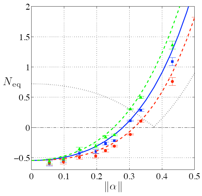 ![]() Figure 2: (Left) Experimental results for the effective phase-independent gain (markers) compared with model (lines) as a function of the input state amplitude. (Right) Experimental results for the Equivalent Input Noise: Average value (squares), maximal value (triangles), and minimal value (circles), compared with model (lines). The performance of conditional noiseless amplification can be significantly improved by replacing the quantum scissors by a sequence of single-photon addition and single-photon addition. This scheme which is illustrated in Fig. 3 has been experimentally tested by Partner UP in collaboration with the group of Professor Marco Bellini at INOA, Florence.