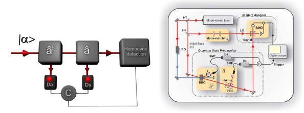 Figure 3: Conceptual scheme (left) and detailed experimental setup (right) of hifi noiseless amplifier. Da and Ds denote single photon detectors, HT (HR) is a high transmissivity (reflectivity) beam splitter; LBO is a lithium triborate crystal for frequency doubling; SMF are single mode fibers; F is a narrow spectral filter. In the experiment, two blocks for conditional single-photon addition and subtraction are placed in the path of a coherent state. A coincident click (C) from the two on/off photo-detectors Da and Ds heralds the successful realization of the probabilistic noiseless amplification of the input coherent state. High-frequency, time-domain, balanced homodyne detection is then used for a full reconstruction of the involved quantum states. The amplifier was thoroughly characterized for a range of input coherent states with amplitude up to =1. In particular, the effective gain of the amplifier, quadrature variances, and fidelity of the amplified state were determined. The experimental results confirm that this high-fidelity noiseless amplifier with nominal gain g=2 achieves the best level of effective gain and final state fidelity ever reached and adds only very little noise. Remarkably, the challenging operation of single photon addition can be replaced by addition of thermal noise while still retaining some crucial properties of the noiseless amplifier. In particular, the resulting scheme is capable of probabilistically increasing the phase information of coherent states based on the addition of thermal noise prior to a weak photon number resolving measurement.